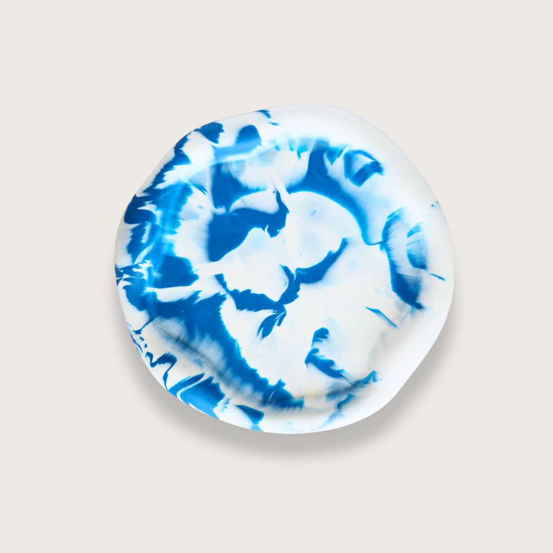 En smuk rund bakke med bløde former og et abstrakt mønster i blåt mod den blide, kalkhvide farve. Hver bakke har sit eget unikke mønster.