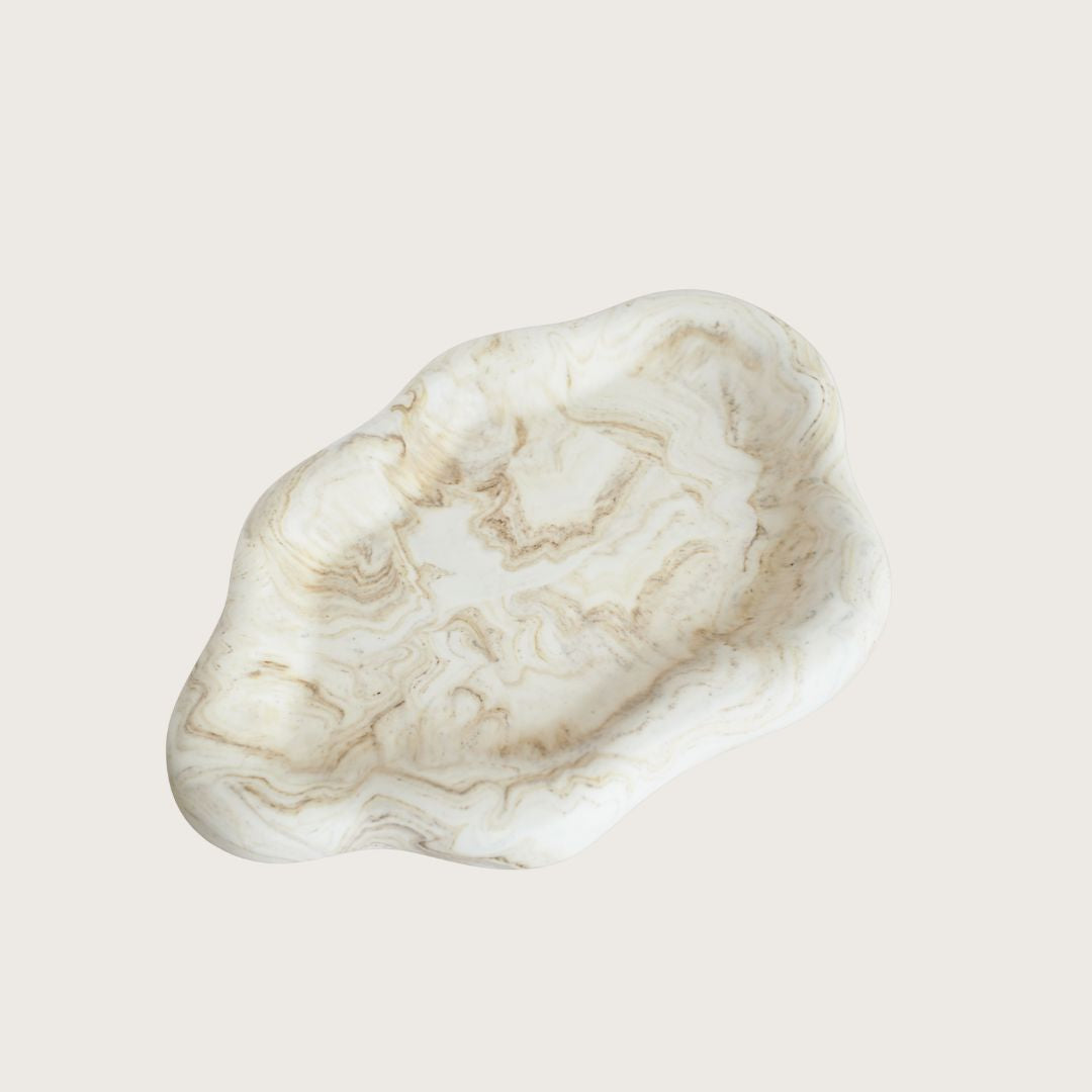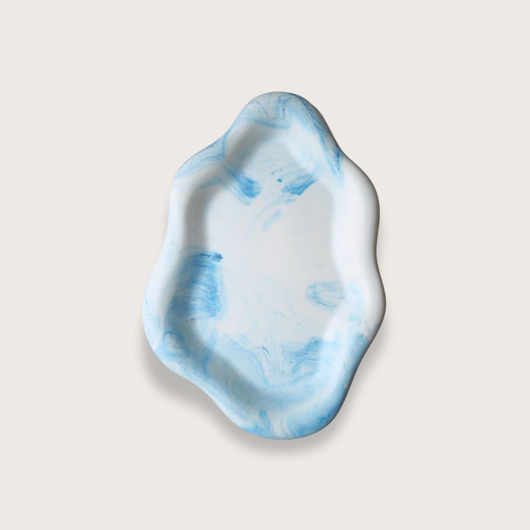 En smuk og organisk bakke med bløde former og et abstrakt blåt mønster mod den blide kalkhvide farve. Hver bakke har sit eget unikke mønster.