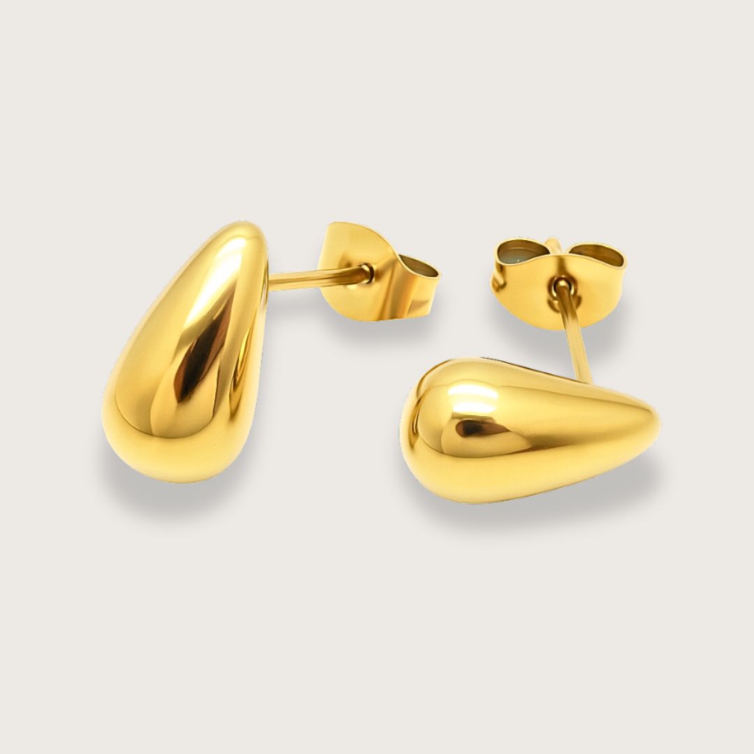 Små elegante dråbeformede ørestikkere i guldbelagt rustfrit stål.