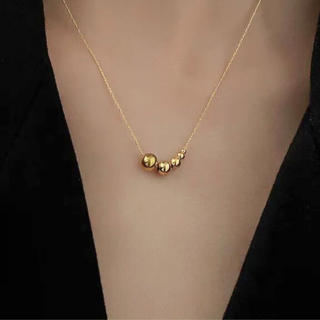 Den tynde halskæde og guldkuglernes tyngde skaber en elegant kontrast, og det enkle design giver halskæden et tidløst udtryk, der kan løfte ethvert outfit.