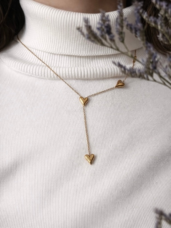 Den tynde halskæde og hjerternes tyngde skaber en elegant kontrast, der kan løfte ethvert outfit.