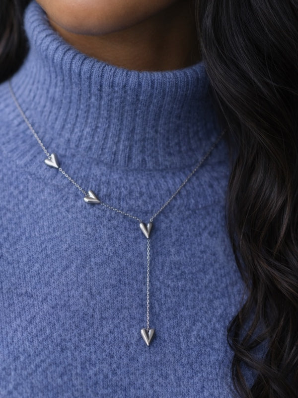Den tynde halskæde og hjerternes tyngde skaber en elegant kontrast, der kan løfte ethvert outfit.