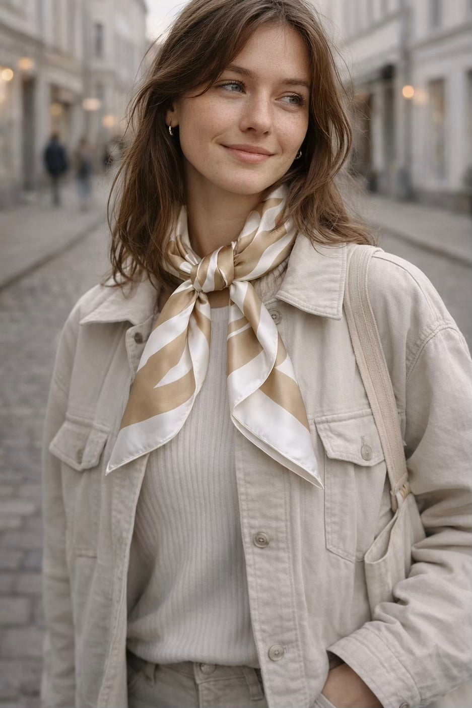 De sandfarvede zebrastriber, der spåes at blive store i foråret/sommeren 2026, er nemmt at style, og tørklædets udtryk ændrer sig, alt efter hvordan det bindes. Om halsen giver det et diskret udtryk, men når det bindes i en trekant om taljen eller som bandana om hovedet, træder de smukke zebrastriber tydeligere frem for et mere trendy og iøjnefaldende look.