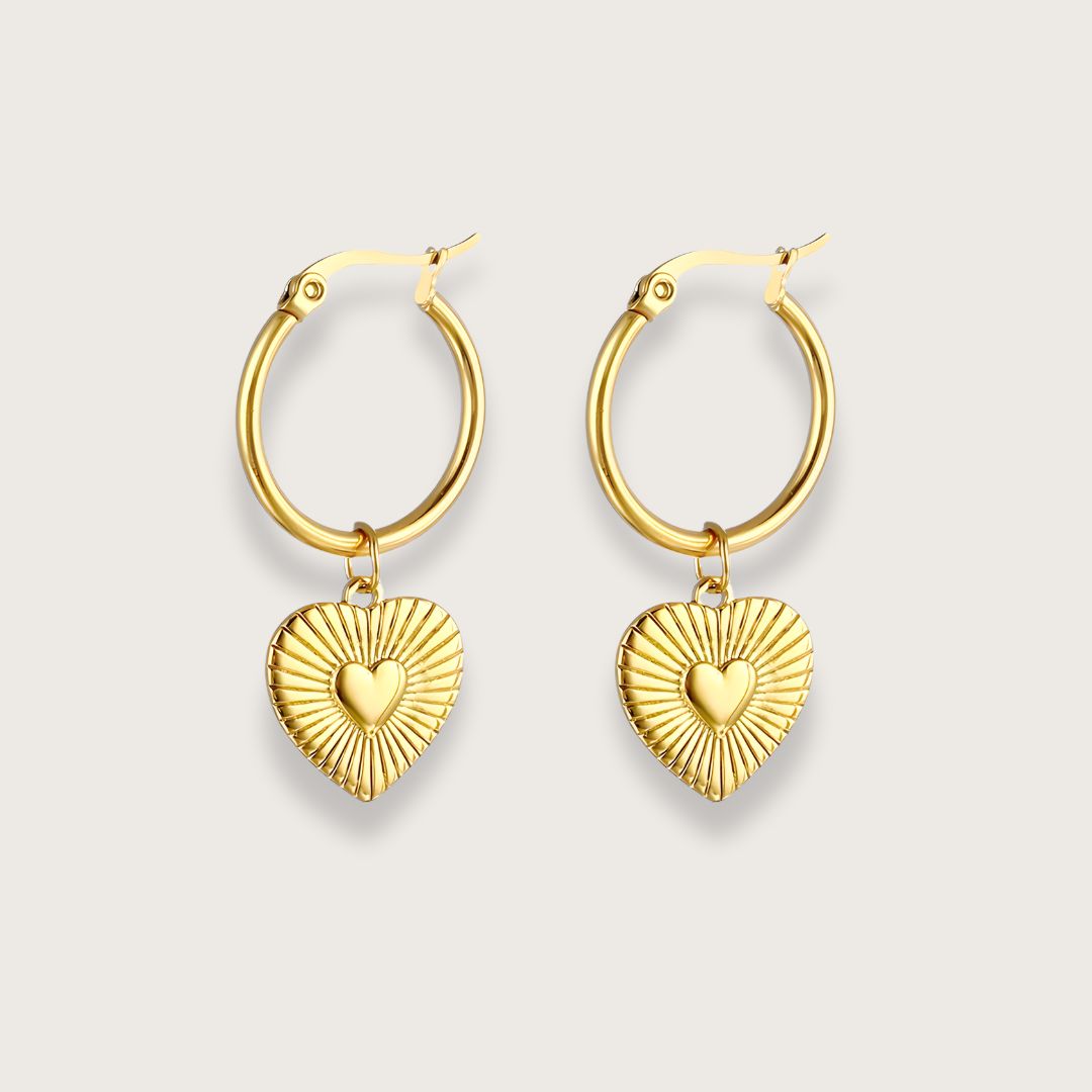 De fine hjertevedhæng har en smuk stråleformet struktur, der giver hoop-øreringene et varmt og elegant udtryk.