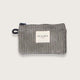 Pungen er syet i kraftigt, blødt fløjl med en let struktur og en neutral grå farve, der passer til det meste. Den lukkes med lynlås og har en lille hank i sort bomuldssnor, så den er nem at tage med. Indvendigt er den foret med solidt, gråt stof, der giver både form og holdbarhed.