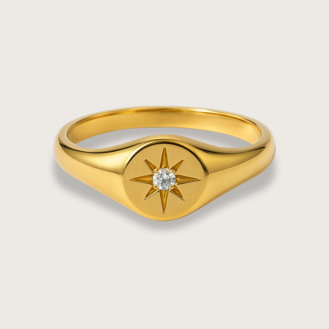 Klassisk guldbelagt signetring med elegant stjernemotiv og lille zirkon.
