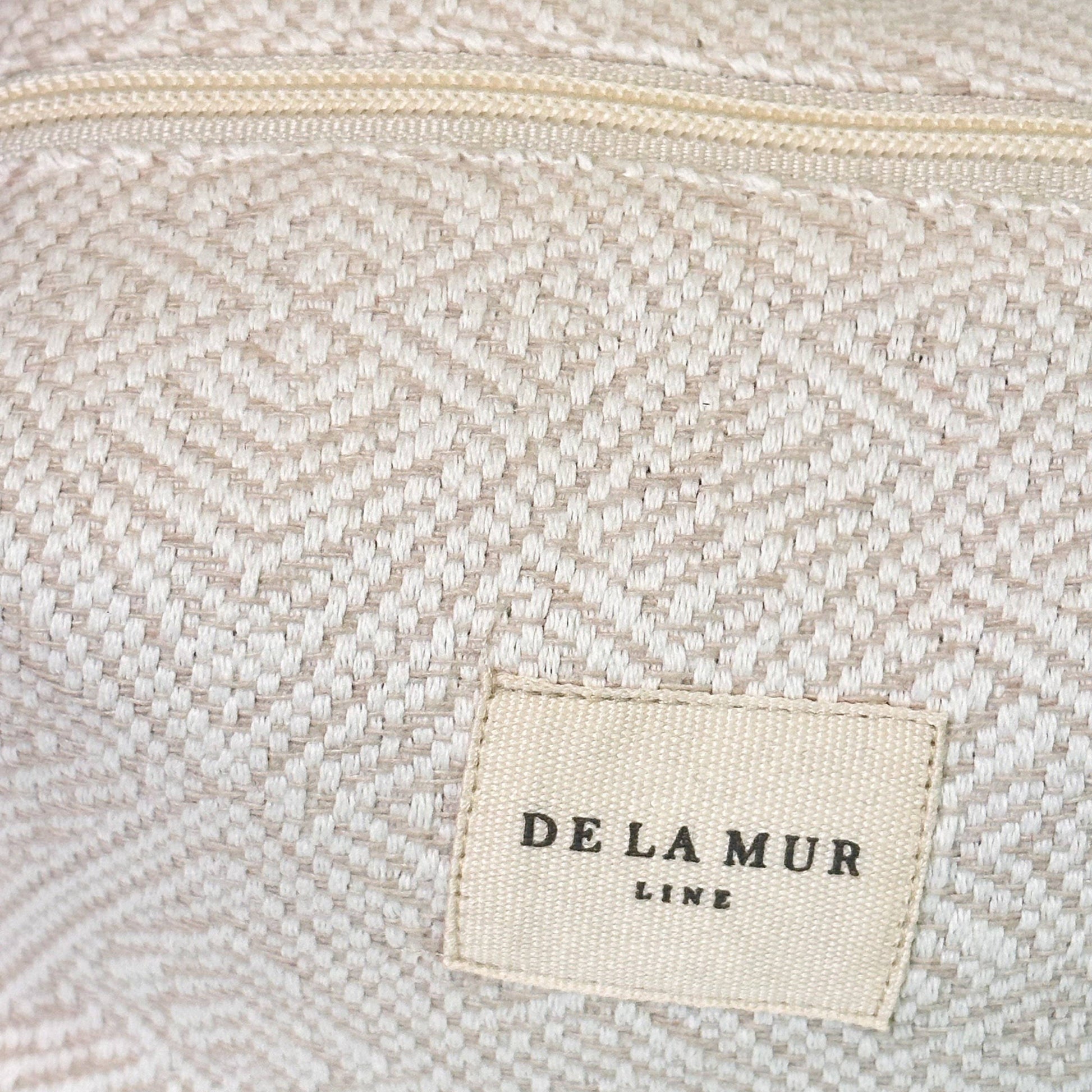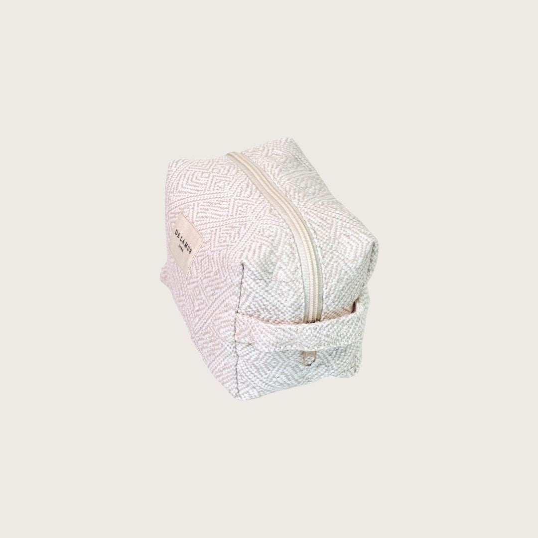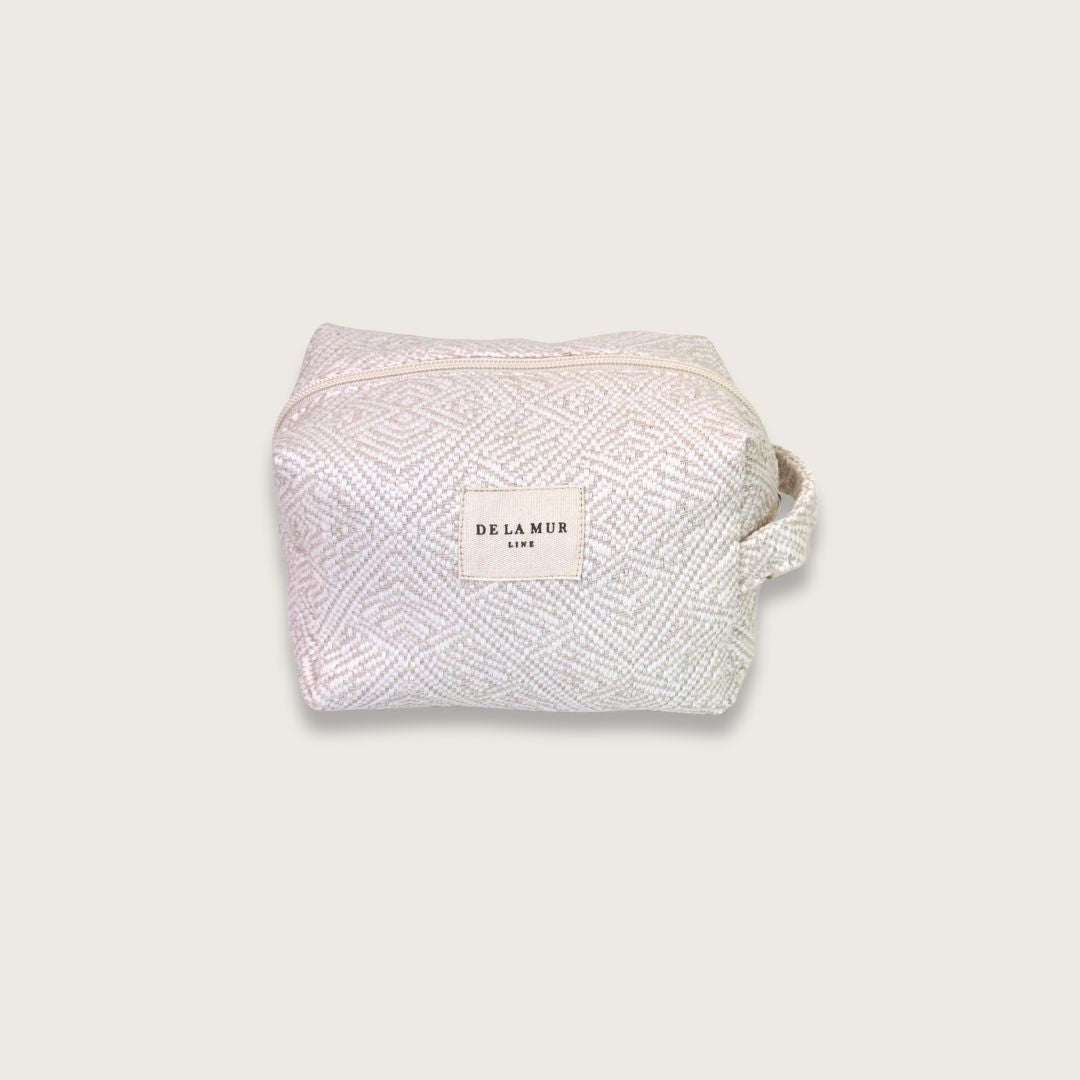 En blød, rummelig toilettaske fra De la Mur i kraftigt hvidt og sandfarvet jacquardvævet bomuldsstof.