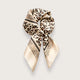 Farvepaletten er rolig og lys med en blød cremefarvet bund, der giver satintørklædet et rent og elegant udtryk. Det afdæmpede leopardmønster i varme nuancer af brun, karamel og sort er blødt og harmonisk og mindre larmende end traditionelle silketørklæder med leopardmønster.