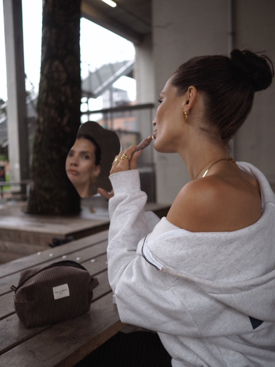 Lille toilettaske i brunt fløjl fra det lille spanske mærke De la Mur. Designet og syet i Spanien.
